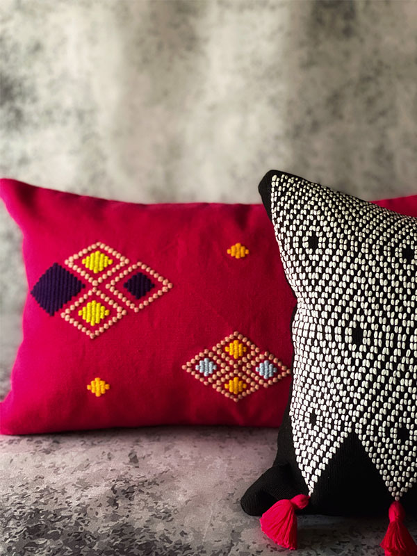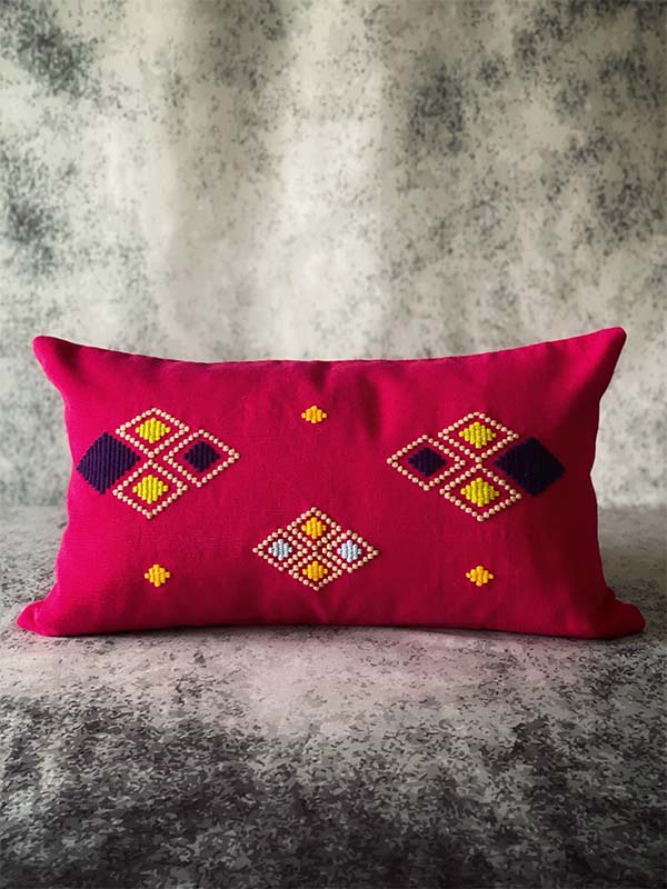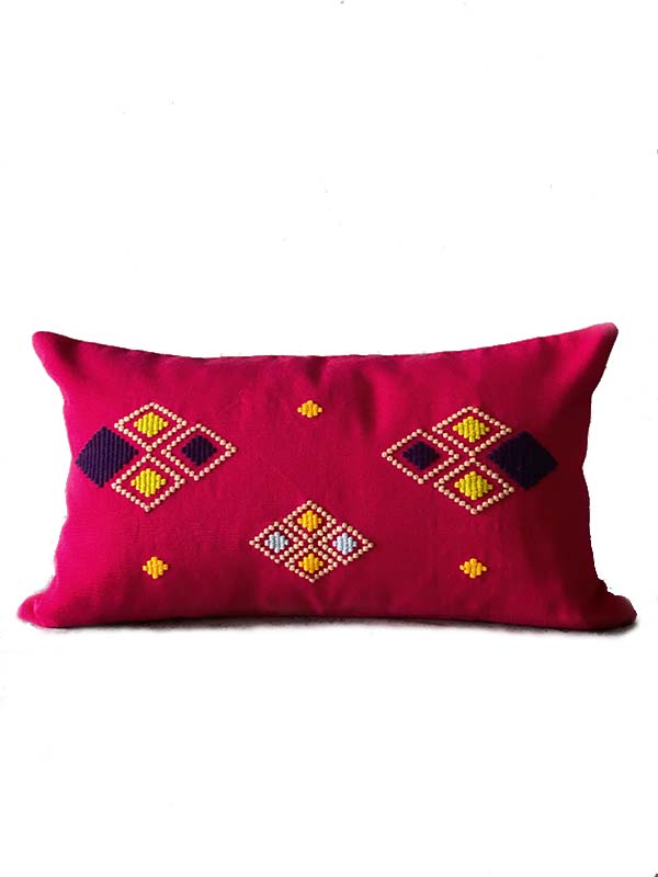 This different kind of “Brocado” (weave) also used in this pillow, is originally from the Tzetzal culture of Chiapas Mexico where mastery comes to achieve the perfection of every stitch, of every weave, to create the perfect shape of a diamond.