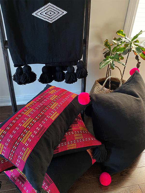 This is our favorite cute pom-pom pillow. It might not have any “Brocado” added, but it has its own handmade colorful, and playful pom-poms. Its whole fabric has been weaved also from scratch through the traditional backstrap loom.